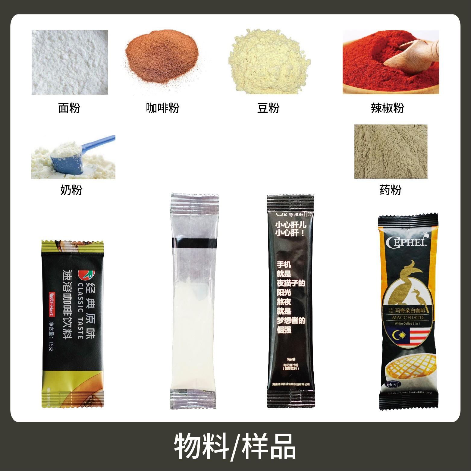 1、適用于食品、醫(yī)藥、化工、化妝品行業(yè)中粉劑物品的計量包裝,如:鹵料粉、奶粉、蛋白質(zhì)粉、咖啡粉等。