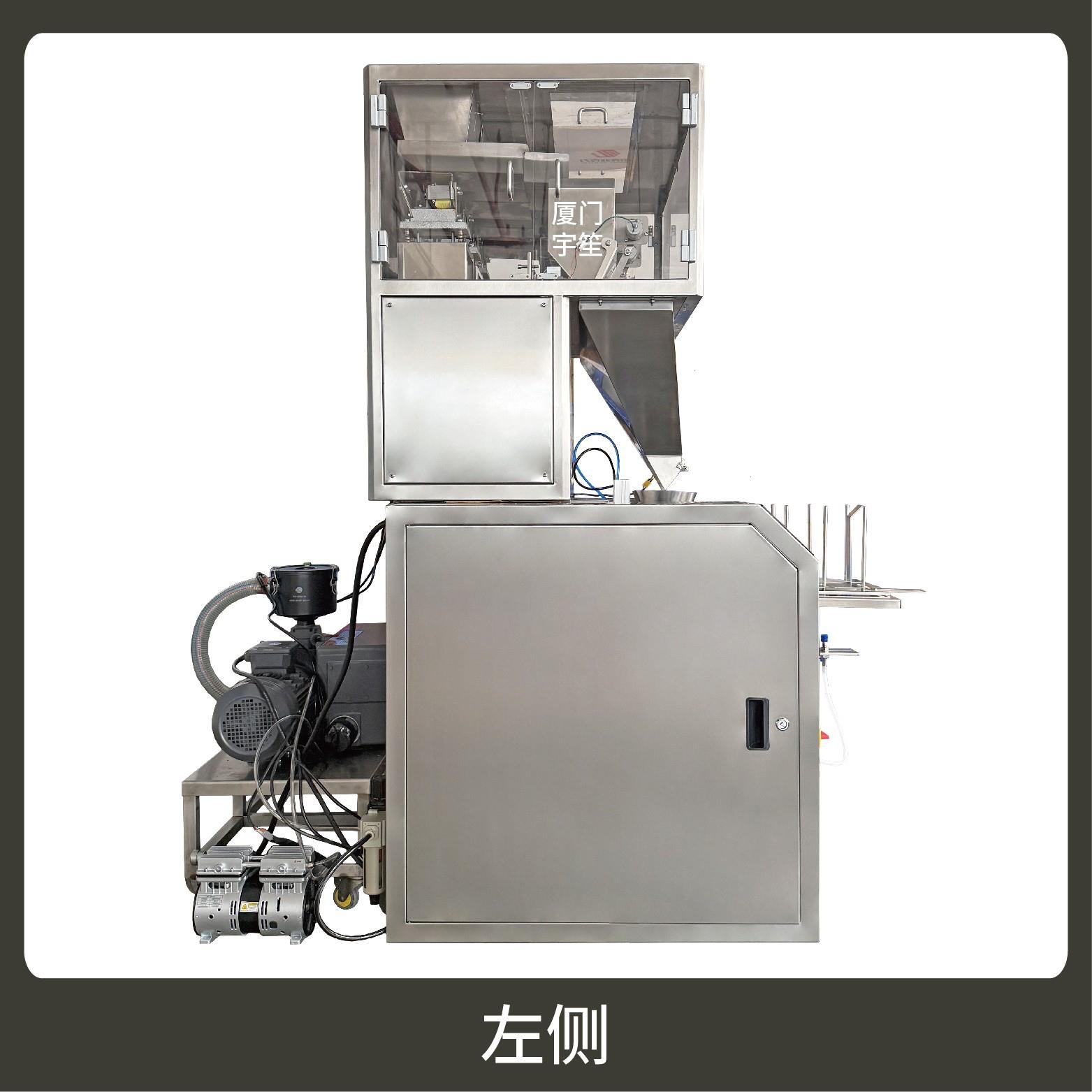 包裝流程全自動(dòng),可抽真空(真空度可達(dá)到-0.1Mpa)??筛鶕?jù)充填物料的性質(zhì)選配不同的下料結(jié)構(gòu)。