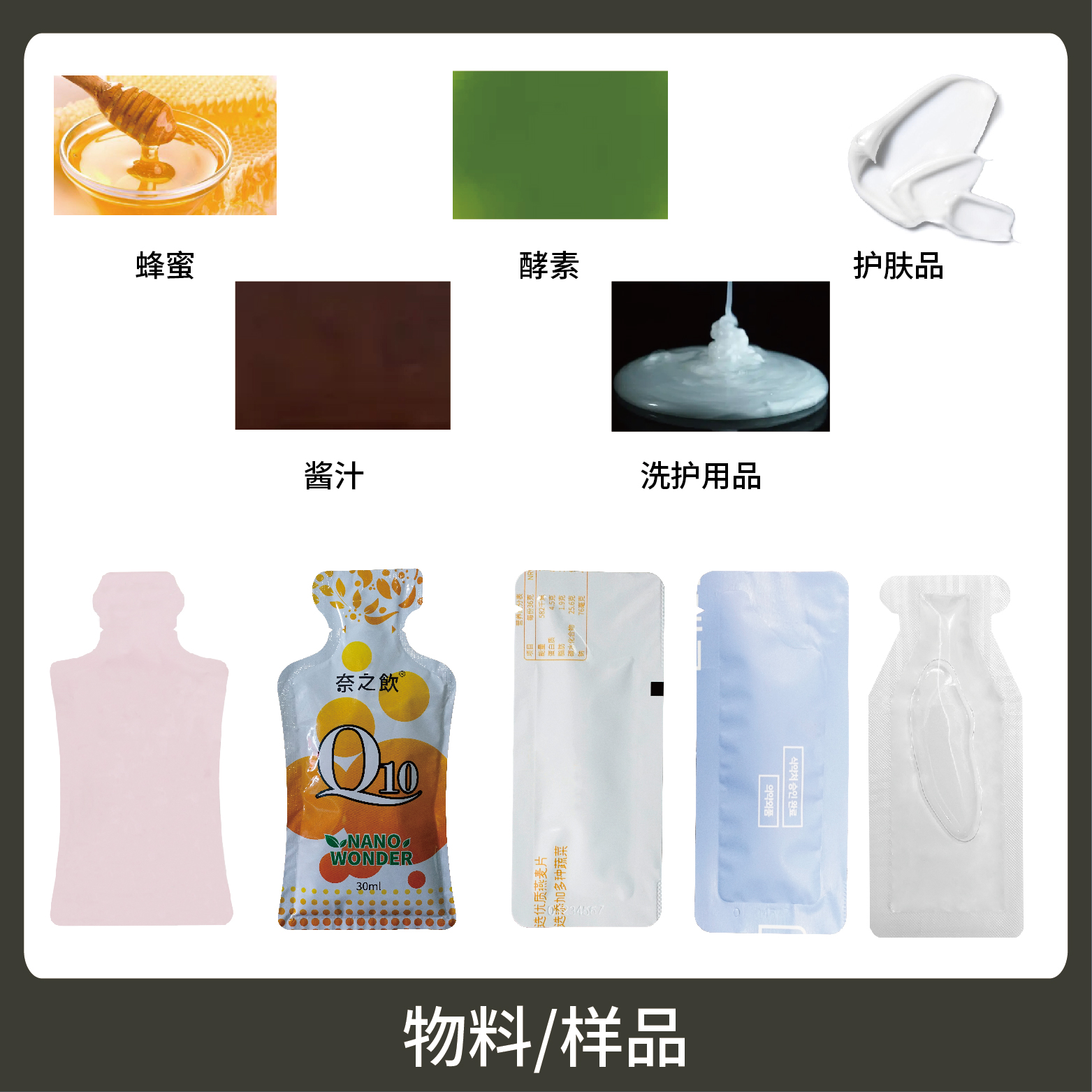1、適用于各行業(yè)中酵素、果汁、漱口水、洗護(hù)用品、染發(fā)劑、化妝品小樣等醬料、液體物品的雙列異形袋計(jì)量包裝。Suitable for the double-row irregular bag metering and packaging of pastes and liquids like enzymes, fruit juices, mouthwash, toiletries, hair dyes, and cosmetic sample sachets in various industries.